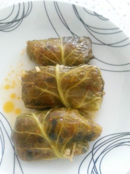 Place 1/6 of the mixture in each leaf and fold in the sides then roll from the soft end to the stalk.